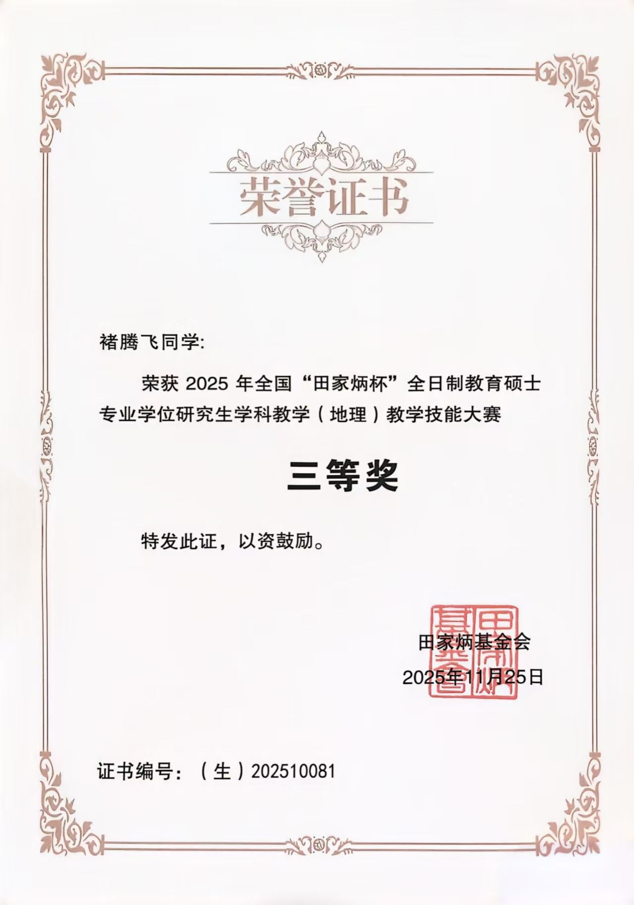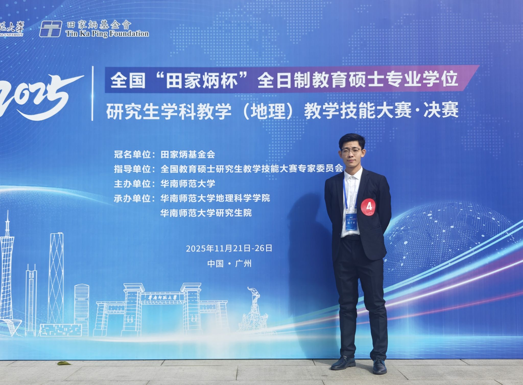 2025年11月21日至22日,2025年全国“田家炳杯”全日制教育硕士学科教学(地理)专业教学技能大赛决赛在华南师范大学顺利举办。经赛前精心筹备与现场激烈角逐,我院褚腾飞同学成功入围决赛,荣获全国三等奖。同时,我校张旭如教授受邀担任本次大赛本科生组评委。