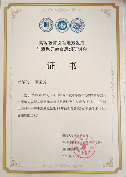 2025年12月5日至7日,我院罗菊芳博士参加由厦门大学教育研究院、苏州城市学院、厦门南洋职业学院主办的高等教育引领地方发展与潘懋元教育思想研讨会。