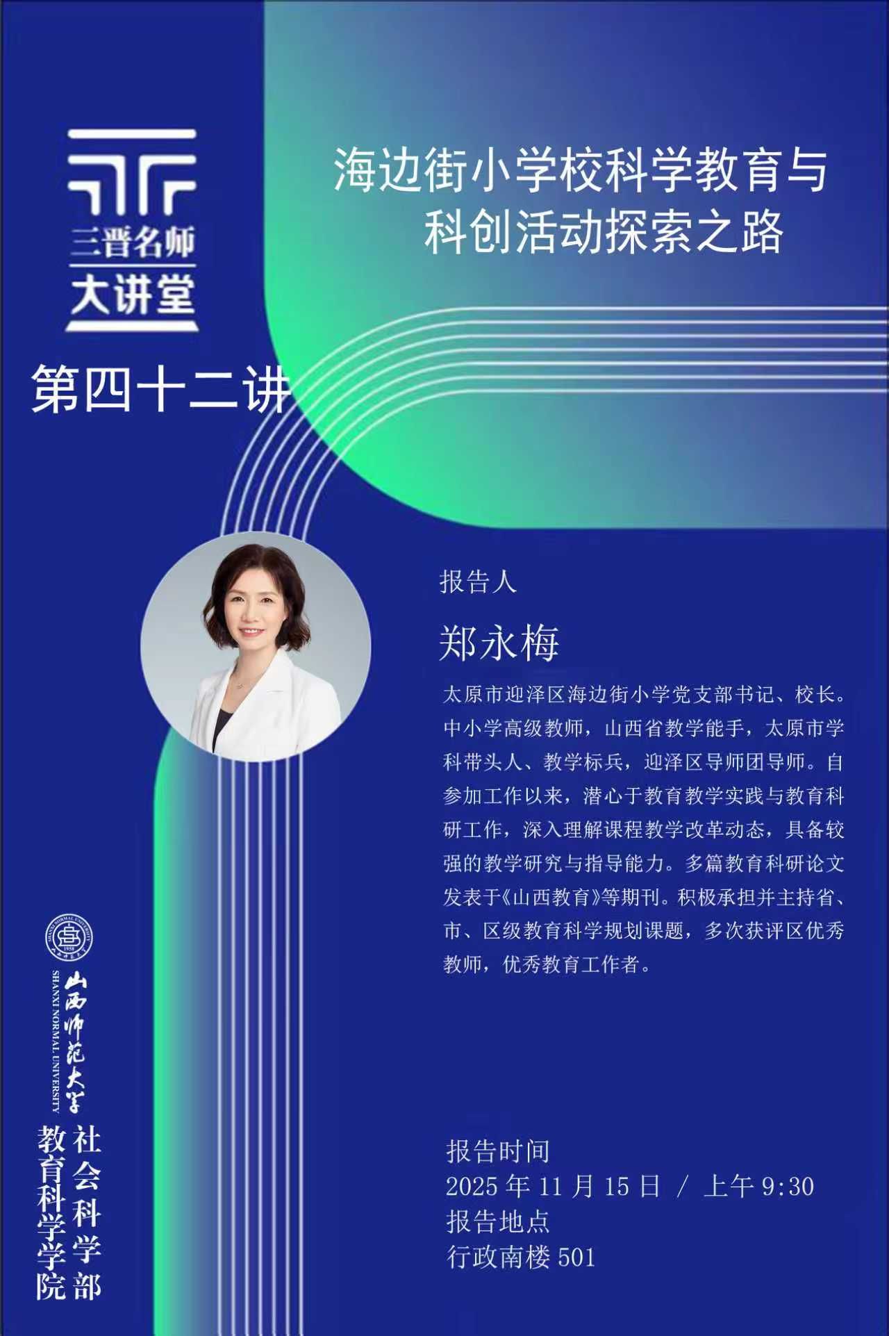 【预告】太原市海边街小学党支部书记、校长郑永梅应邀来我院作学术报告