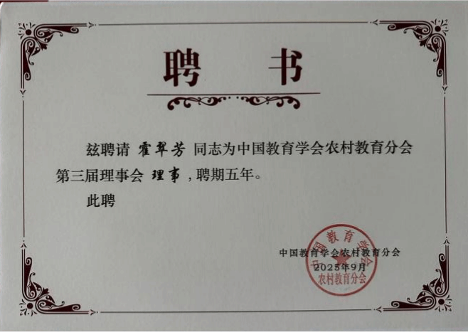2025年9月12日,中国教育学会农村教育分会第三届理事会成立大会在吉林长春召开。按照会议议程,与会代表选举产生中国教育学会第三届农村教育分会理事会。我院霍翠芳老师当选理事。