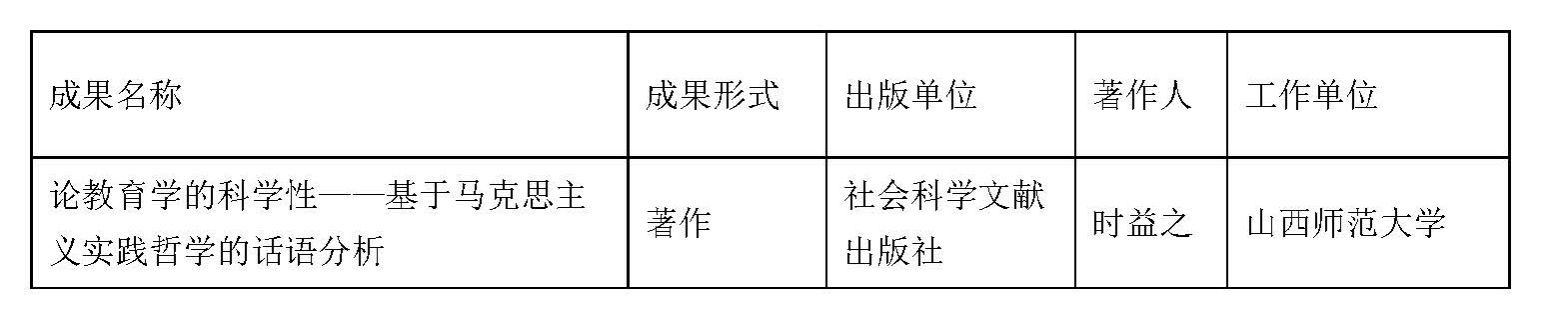 近日,山西省社会科学研究优秀成果“百部(篇)工程”评审委员会公布了《2024年度山西省社会科学研究优秀成果“百部(篇)工程”获奖成果公示》, 我院教师时益之副教授的著作《论教育学的科学性——基于马克思主义实践哲学的话语分析》获2024年度山西省社会科学研究优秀成果“百部(篇)工程”一等奖。