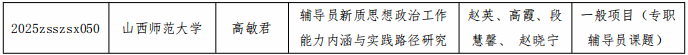 近日,省教育厅公布了2025年度山西省高等学校哲学社会科学研究项目(思想政治教育专项)立项结果,我院专职辅导员高敏君申报的《辅导员新质思想政治工作能力内涵与实践路径研究》成功入选。该项目聚焦新时代背景下辅导员思想政治教育工作的创新发展需求,探索提升辅导员专业化、职业化水平的实践路径。
