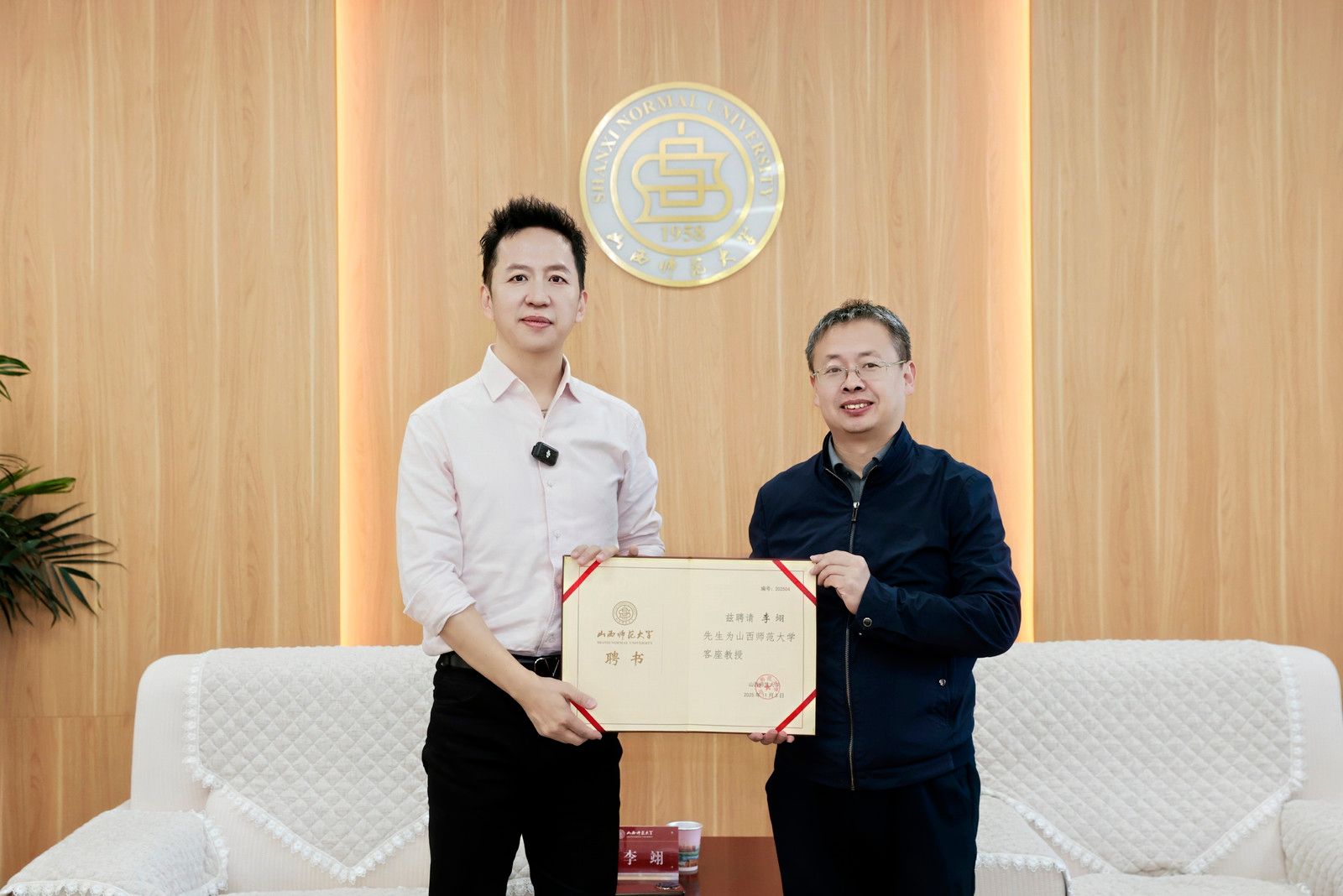 签约仪式前,副校长白文宏在行政北楼207接待室会见了猿编程创始人李翊及其团队一行,并为李翊颁发客座教授聘书,对猿编程在青少年人工智能教育领域的前沿探索及成绩表示肯定,并就院企在人工智能教育领域的合作提出了殷切希望。