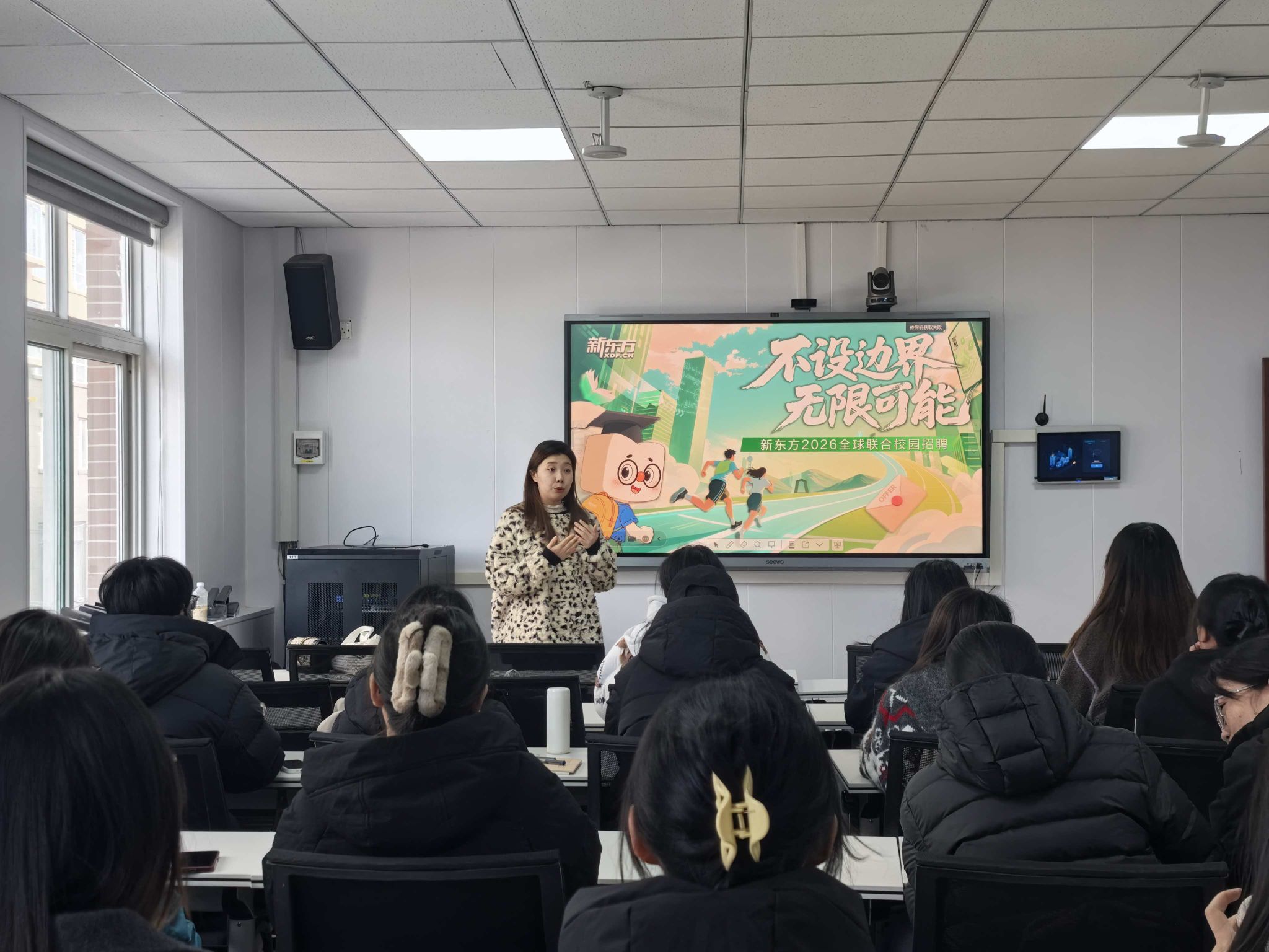 11月18日下午,我院邀请新东方在8号楼212会议室召开专场招聘宣讲会,2026届毕业生参加了本次会议。会议由学院就业专员李颖主持。