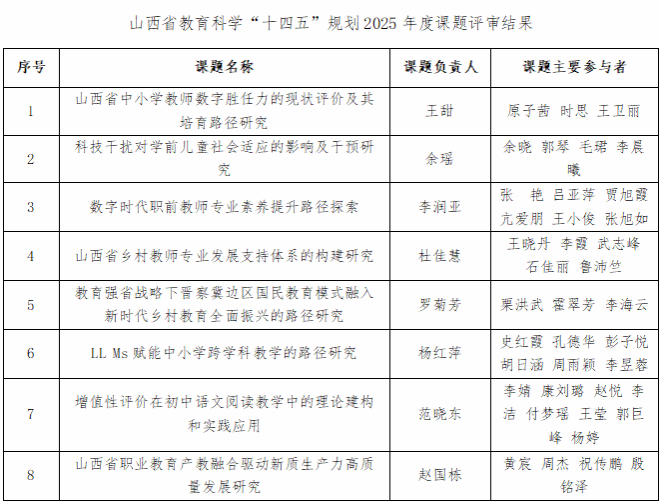 近日,山西省教育科学规划领导小组办公室公示了省教育科学“十四五”规划2025年度课题评审结果,我院共有8项课题入选公示名单。