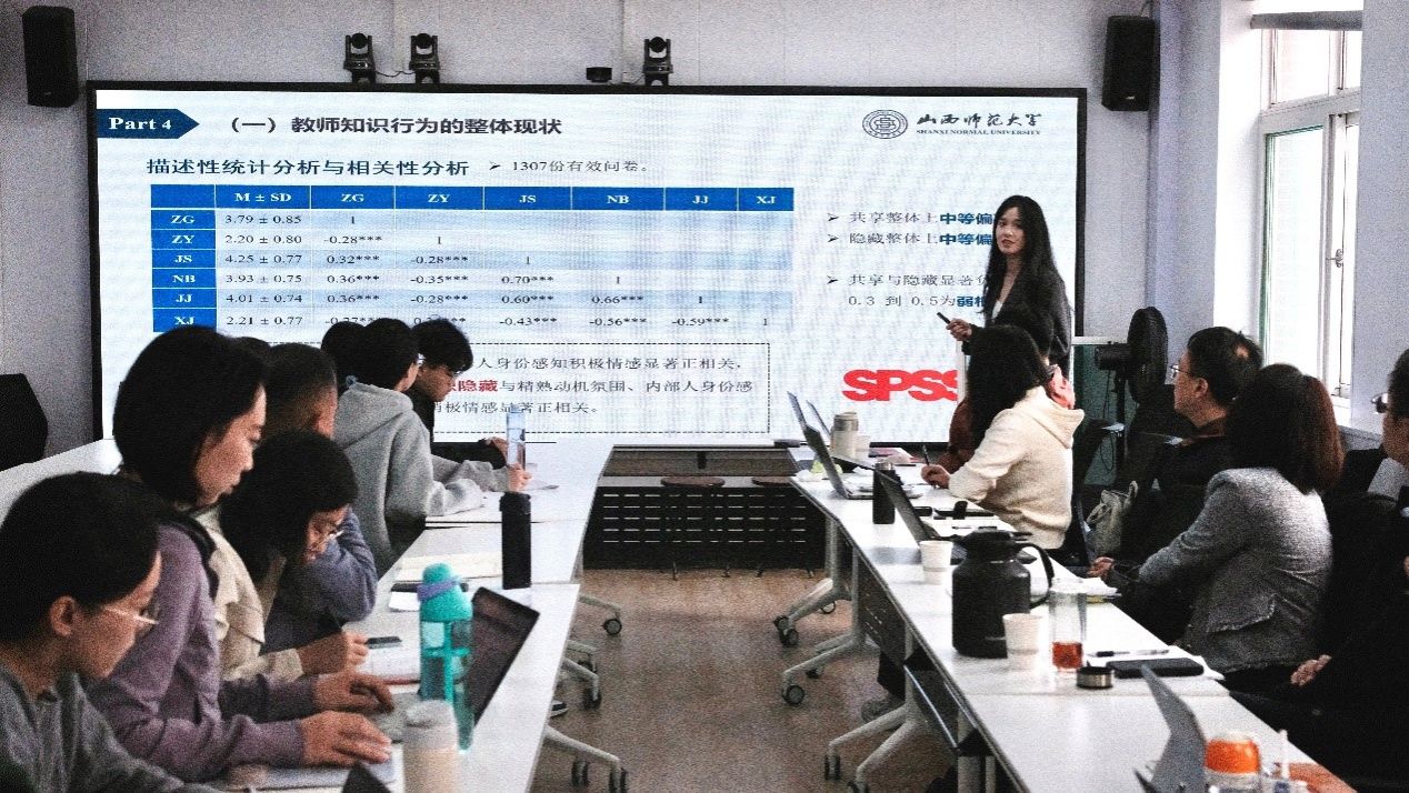 此次学术沙龙分为报告分享、学术指导、总结点评三个环节。在报告分享环节,赵国栋博士、时思博士、闫领楠博士分别作了题为《乡村教师缘何疏离数字技术》《学校动机氛围对中小学教师知识行为的影响机制》《生态危机视域下教育空间的转向与重构》的专题分享。在学术指导环节,张海燕老师详细介绍了《教师教育研究》期刊的基本情况、主题类型和选题分析,重点介绍了期刊的审稿要点,并就“高质量学术论文的基本特征”“如何写好一篇高质量学术论文”等与老师们做了交流分享。针对三位博士的研究,张海燕老师从主题选择、研究范式、参考文献和后续修改发表流程等角度提出了建设性意见和建议。最后,赵英院长进行了总结点评,并对三位博士的研究和汇报提出了针对性的优化意见。