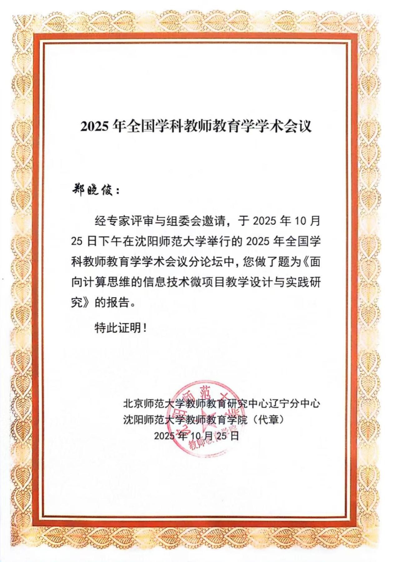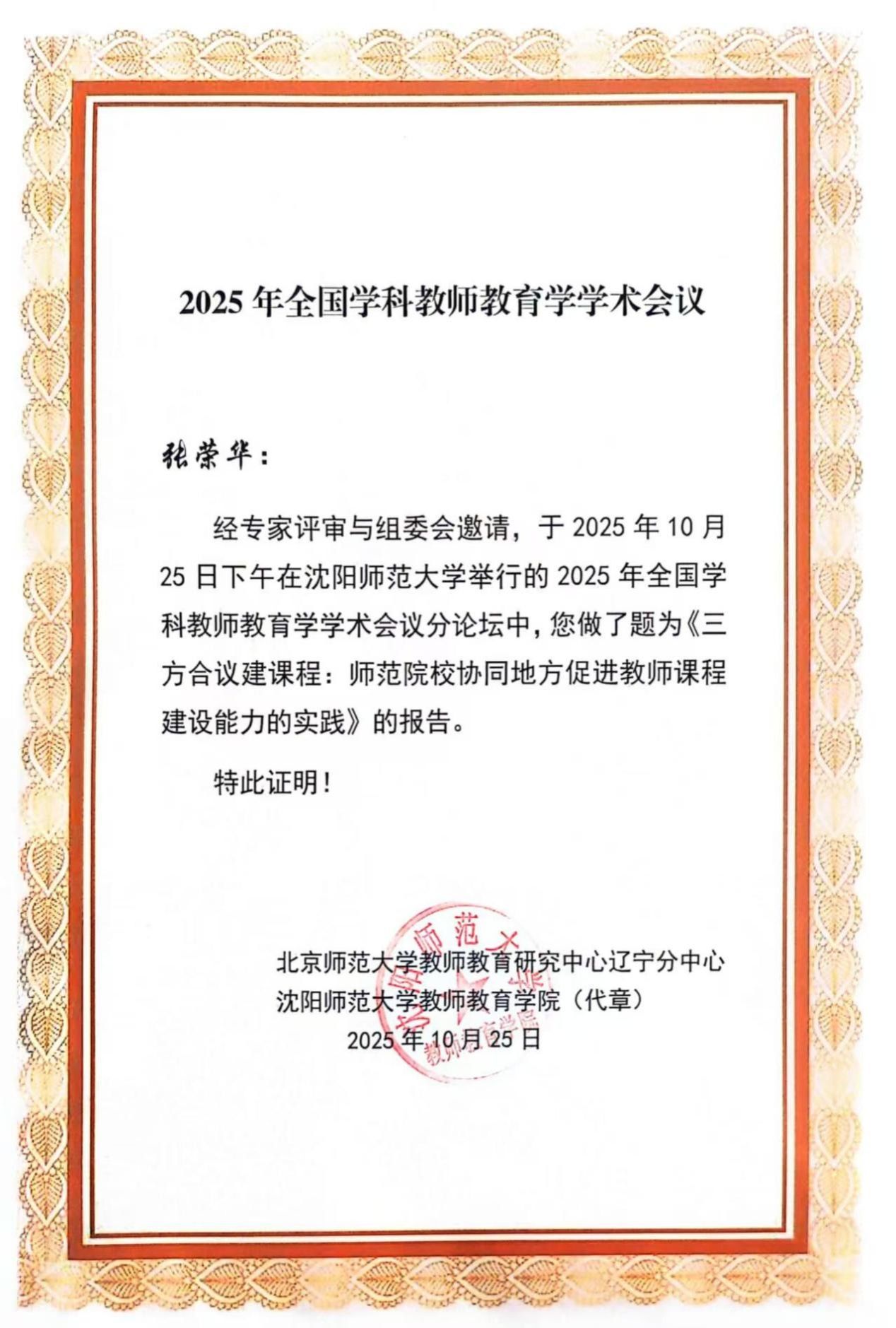 2025年10月25日至26日,我院教师张荣华和郑晓俊参加了在沈阳师范大学举办的2025年全国学科教师教育学学术会议。会议围绕“数智时代的学科教师教育学:理论重构与实践创新”这一主题展开,由沈阳师范大学及教育部普通高校人文社会科学重点研究基地北京师范大学教师教育研究中心主办,沈阳师范大学教师教育学院及北京师范大学教师教育研究中心辽宁分中心承办。