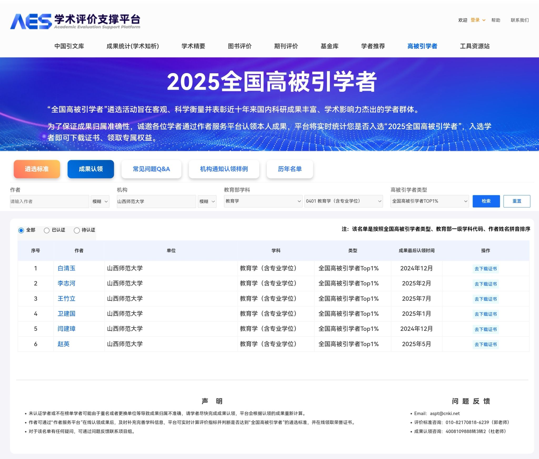 近日,中国知网下属的中国科学文献计量评价研究中心发布了“2025全国高被引学者”榜单。我院教育学学科共15位教师入选,较上年增加了3人,增幅达25%。其中,6位教师入选“全国高被引学者TOP1%”,9位教师入选“全国高被引学者TOP5%”,从一个侧面彰显出我院教师对教育科研与学科发展的贡献和学术影响力。