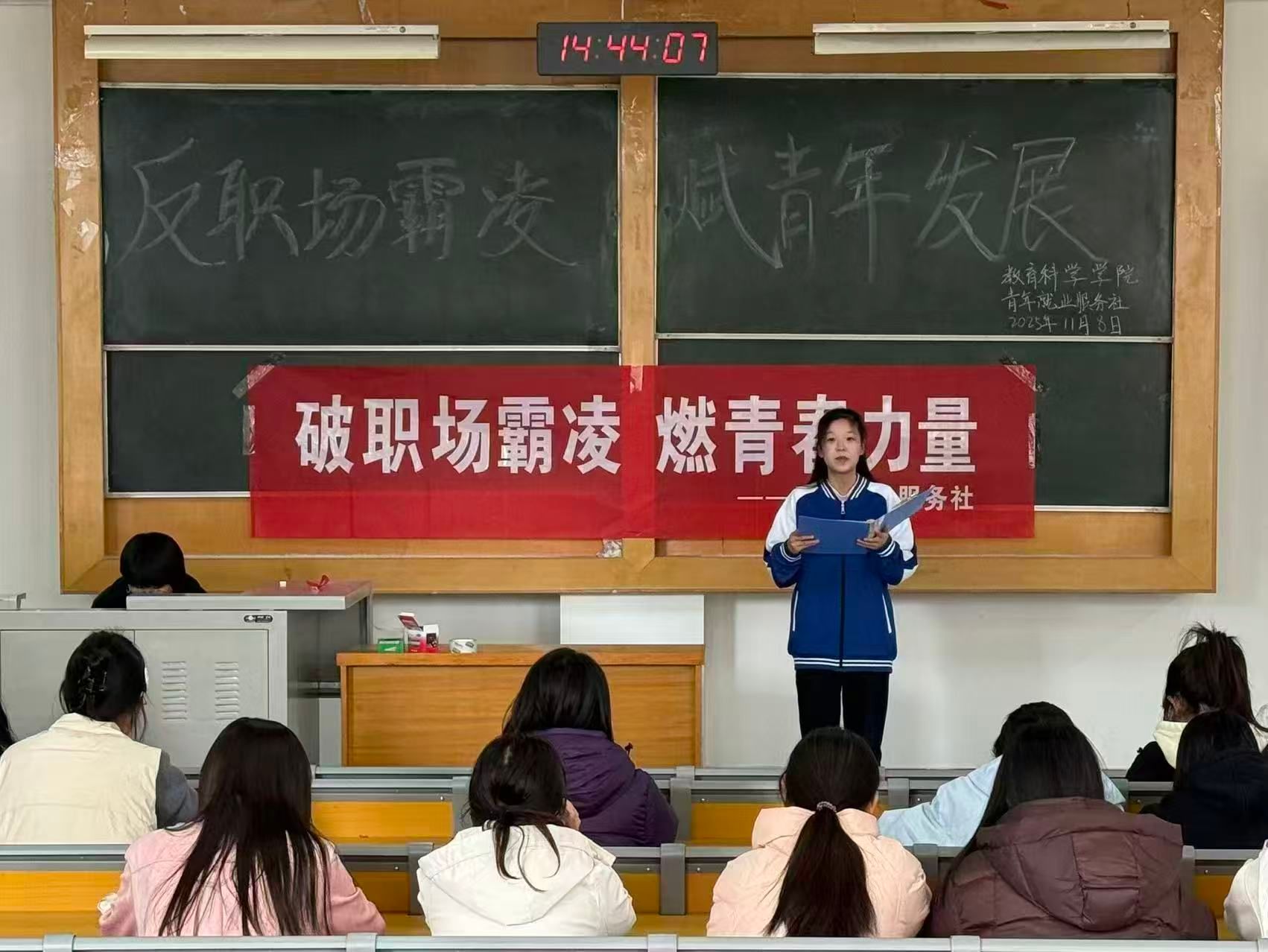11月8日,我院青年就业服务社在南区5107教室开展“筑牢职场防线,赋能青年发展”活动,助力学生筑牢职场权益防护屏障。