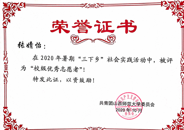 2020年暑期三下乡校级优秀志愿者